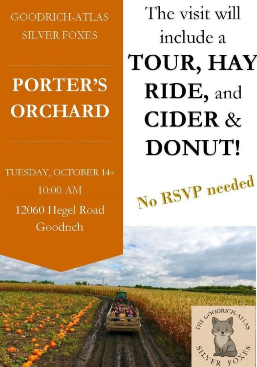 The Goodrich-Atlas Silver Foxes is a social group for local senior citizens, offering fun activities, outings, and opportunities to connect with friends and neighbors. Open to residents 60 years and older, the group meets regularly to enjoy events such as tours, games, crafts, and community gatherings. It’s a welcoming way for seniors to stay active, engaged, and involved in the community.